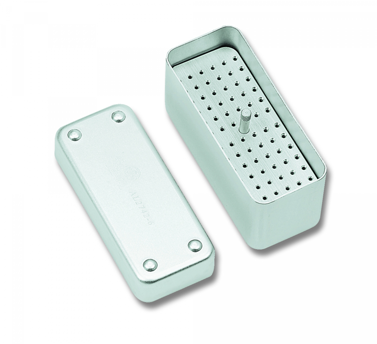 ENDO MINI BOX Contenitore per endodonzia, in alluminio anodizzato. Provvisto di coperchio. Modello per strumenti canalari - Colore argento. Rettangolare. Misura 100x44x54 mm. Confezione: 1 pezzo