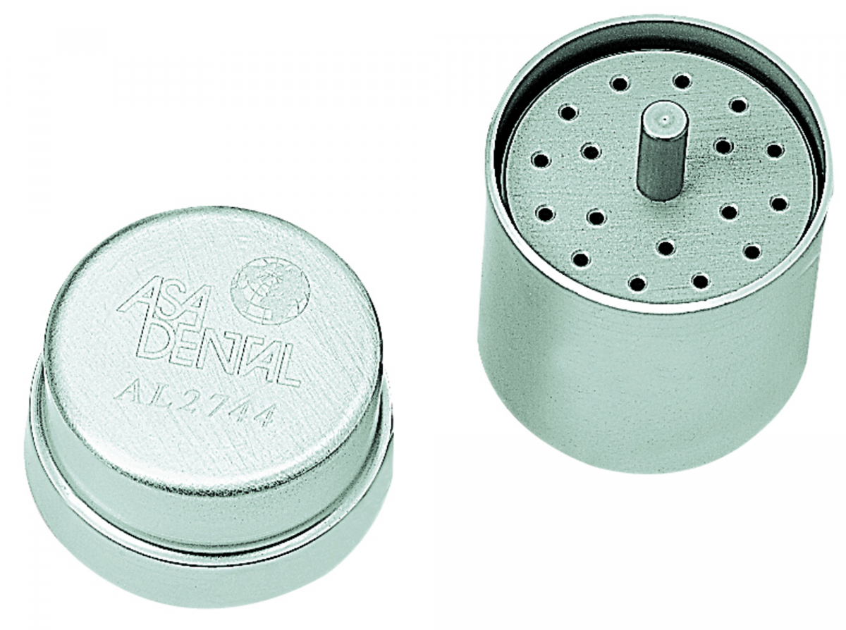 ENDO BOX Contenitore per endodonzia, in alluminio anodizzato. Provvisto di coperchio. Modello costituito da un unico tray, per strumenti canalari - Colore argento. Rotondo, Ø 48 mm - Altezza 62 mm. Confezione: 1 pezzo