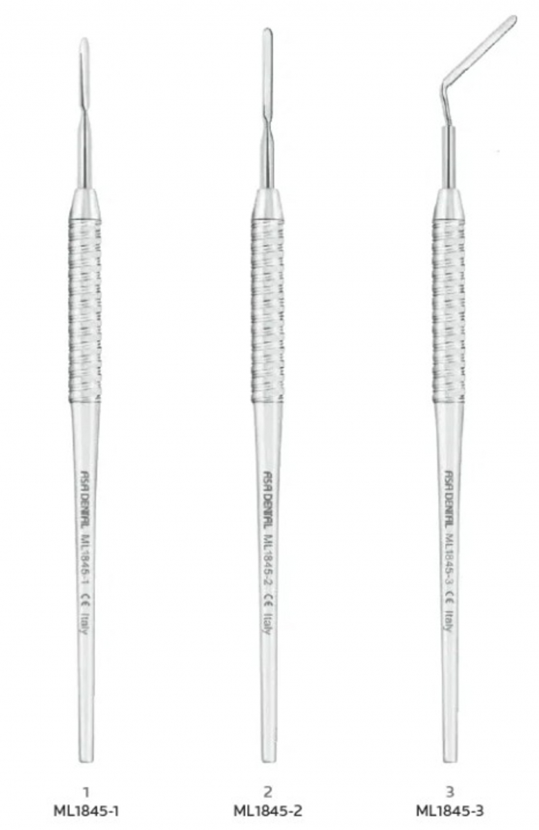 Appartiene alla linea “Leonardo” di ASA Dental, che prevede un manico Leonardo ML in acciaio inossidabile di diametro maggiorato (7,0 mm), con solchi elicoidali per migliorare la presa e ridurre l’adesione di residui. Lo strumento è riutilizzabile e sterilizzabile in autoclave; non è monouso. Viene distribuito in almeno tre varianti / figure (FIG. 1, 2, 3), corrispondenti a configurazioni differenti della punta (diritta, curva, angolata) a seconda dell’area anatomica d’impiego.