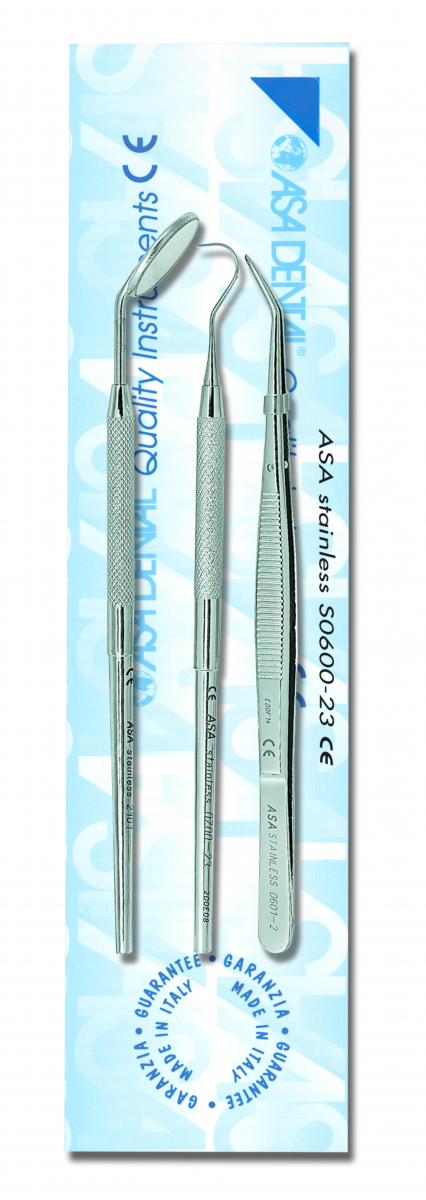 SERIE STRUMENTI PRIMA VISITA :Manico+specchietto n° 4, sonda n.23, pinzetta london-college