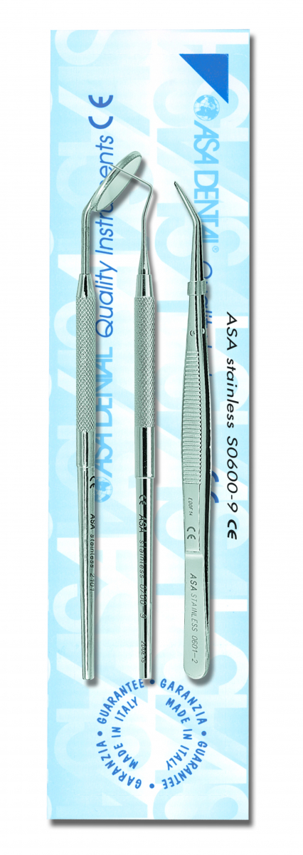 SERIE STRUMENTI PRIMA VISITA: Manico+specchietto n° 4, sonda n. 9, pinzetta london-college