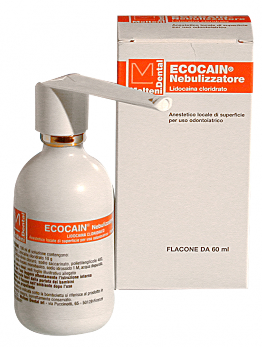 ECOCAIN 10% NEBULIZZATORE (A.I.C. nr. 027388091) Anestetico locale, ad azione rapida ed efficace. Contiene lidocaina cloridrato al 10%, ed è particolarmente indicata come anestesia di superficie, prima della detartrasi o per brevi interventi pedodontici. Flacone spray da 60 ml