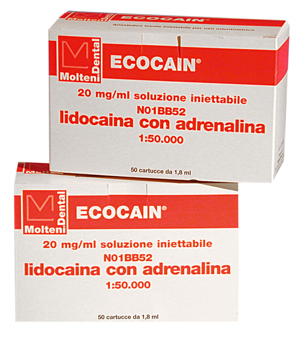 Anestetico locale, ideale per interventi conservativi e chirurgici di odontostomatologia, ad azione rapida ed efficace: i tempi di induzione infatti sono molto brevi (max 5 min.). A base di lidocaina, non contiene parabenzoati ed è altamente tollerata. Ecocain 20 mg/ml soluzione iniettabile con Adrenalina 1:50.000 (A.I.C. nr. 027388089) Indicata per gli interventi di lunga durata, dov'è obbligatorio un controllo del sanguinamento chirurgico. Confezione da 50 cartucce in blister