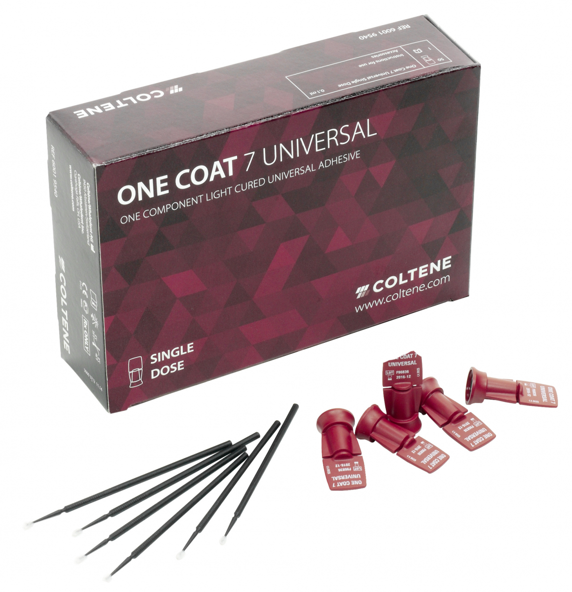 ONE COAT 7 UNIVERSAL Adesivo universale monocomponente all- in-one indicato per tutte le tecniche di applicazione; auto-mordenzatura, mordenzatura totale o selettiva, One Coat 7 Universal soddisfa tutte le esigenze. Con la massima efficacia permette l'adesione di materiali come oro, titanio, ceramiche, ossido di zirconio e composito, sempre senza necessità di applicare primer o silano. Valori di adesione eccezionali su smalto e dentina, eccellente sigillo marginale, minima sensibilità post- operatoria. Confezione: 50 Single Dose + 50 pennellini neri
