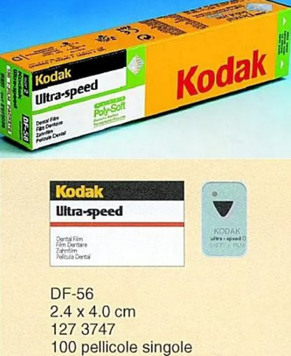 Pellicola a media sensibilità per uso endorale (sensibilità classe D) Da utilizzare con filtro di sicurez za KODAK GBX-2 - Ottimo contrasto -Buona risoluzione - Adatta per trat tamento manuale o automatico.