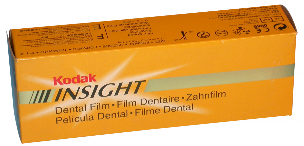 Pellicole radiografiche intraorali, cartonate, per bite-wing. La differenza con le normali pellicole DF, consiste nel fatto che le Insight riducono fino al 60% l'esposizione alle radiazioni. Confezione da 100 pellicole 2,7 x 5,4 cm
