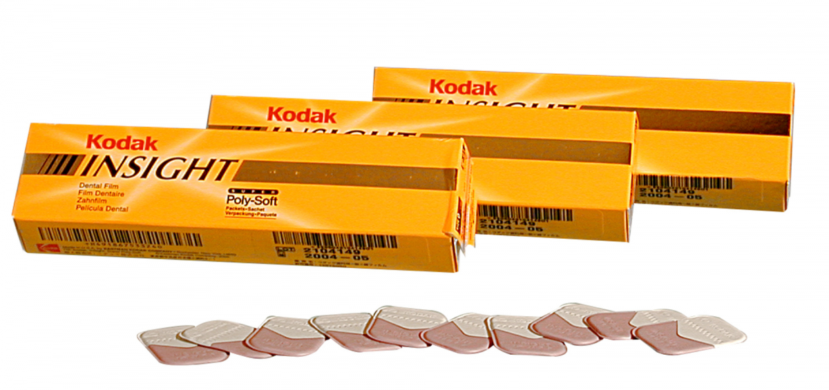 Pellicole radiografiche intraorali. La differenza con le normali pellicole DF, consiste nel fatto che le Insight riducono fino al 60% l'esposizione alle radiazioni. Confezione da 100 pellicole 2,2 x 3,5 cm