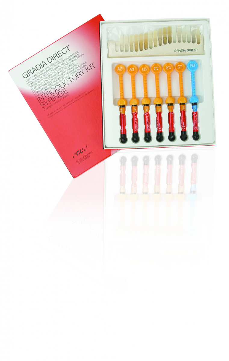 GRADIA DIRECT Composito a riempitivo ceramico, microibrido, fotopolimerizzabile, per restauri diretti dall'eccellente qualità estetica. Grazie alla sua particolare struttura interna, che imita quella del dente naturale, è possibile ottenere otturazioni belle e naturali già con una sola delle tinte Standard. Inoltre, sovrapponendo un trasparente (per esempio il neutro NT) ad una delle masse Standard, un normale restauro è già praticamente invisibile. Quando le esigenze estetiche sono maggiori infine, si può adottare la metodica di stratificazione con le masse aggiuntive Outside Special (traslucide) per restauri anteriori e posteriori, ed Inside Special (opache) per restauri anteriori. Intro Kit 7 siringhe: 6 siringhe da 4 gr cad. per anteriori (4 nei colori standard A2, A3, A3.5, CV, 1 nel colore inside special AO3 e 1 nel colore outside special CT), 1 siringa da 4,7 gr per posteriori nel colore standard P-A2 e una scala colori