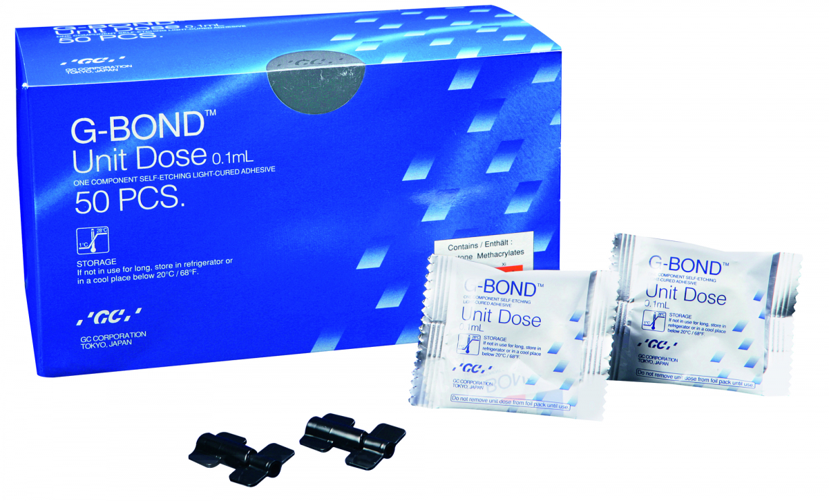G-BOND Adesivo smalto-dentinale monocomponente, automordenzante, fotopolimerizzabile, indicato nell'adesione di compositi e compomeri. La sua composizione priva di HEMA, a base di 4-MET ed estere di acido fosforico, garantisce un legame stabile e durevole con smalto e dentina, sia asciutti che bagnati: l'umidità infatti non influisce sull'adesione. Grazie alla sua consistenza, l'applicazione è semplice e particolarmente rapida (30 secondi): è sufficiente applicare un solo strato di adesivo, aspettare 10 secondi, asciugare con aria alla massima pressione e fotopolimerizzare. Starter Kit Monodose: 50 monodosi da 0,1 ml cad. + 50 applicatori