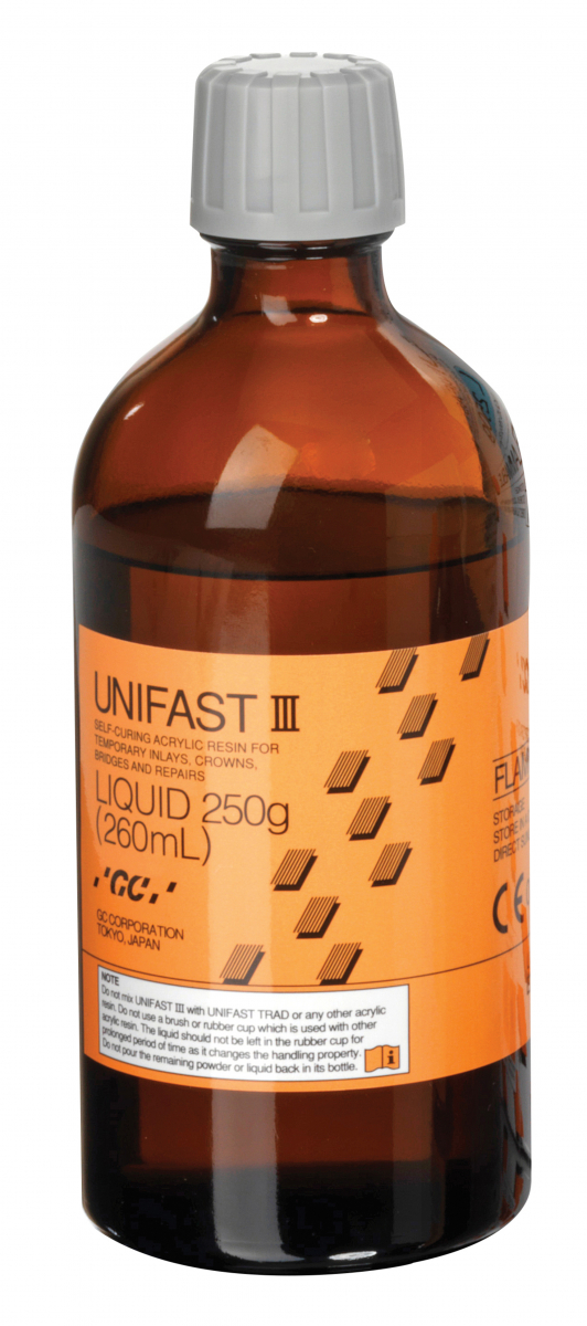 UNIFAST III Resina acrilica autoindurente per corone, ponti e restauri. La sua formulazione basata sulla tecnologia SURF (tecnologia di fissaggio rivoluzionaria per una superficie uniforme) garantisce cementi senza bolle, duraturi e con una colorazione eccezionalmente omogenea. Confezione: liquido da 260 ml