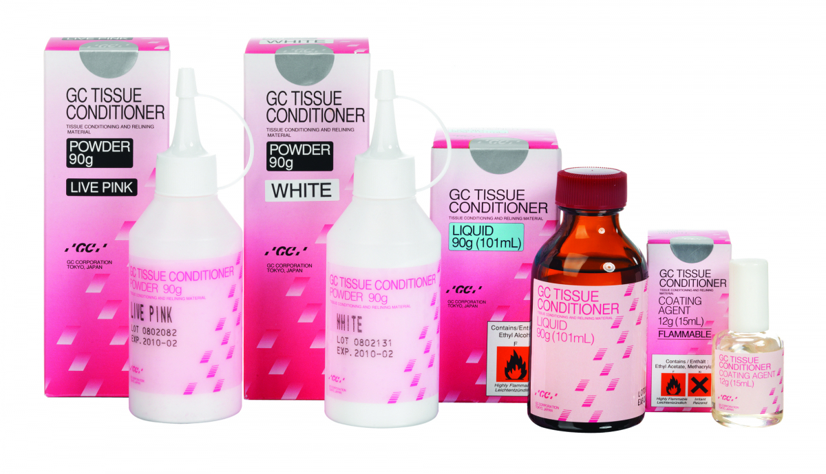 TISSUE CONDITIONER Resina ribasante estremamente soffice per il condizionamento dei tessuti infiammati in protesi mobile, l'impronta funzionale di lungo periodo ed il carico immediato in implantologia. Rimane a lungo soffice e pulita; consistenza e fluidità perfette, solo 5 min. di posa nel cavo orale. Possibilità di impronte funzionali con la versione di colore bianco. Confezione Ricambio: liquido da 101 ml