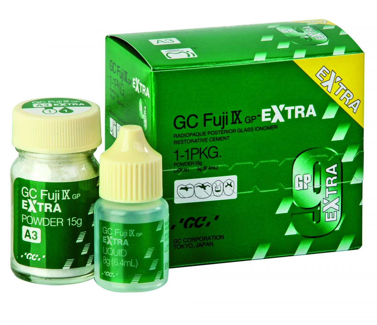 FUJI IX GP EXTRA Cemento vetroionomero radiopaco a elevata resistenza con una nuova generazione di riempitivo in vetro che conferisce al restauro un'altissima traslucenza duratura nel tempo. Il risultato è un'estetica veramente eccellente. Il rilascio maggiore di fluoro garantisce una protezione ancora migliore contro la carie. Grazie al tempo di lavoro prolungato e all'indurimento extra-rapido, l'operatore può iniziare le fasi di finitura e lucidatura dopo solo due minuti e mezzo dall'inizio della miscelazione. Indicato per restauri permanenti o provvisori di classe I e II in denti decidui, per restauri di classe I e II non sottoposti a carico in denti permanenti, per restauri di classe V e restauri su superfici radicolari, stratificazione dei monconi. Adatto all'uso con un composito o un inlay nella tecnica sandwich immediata o ritardata. Polvere da 15 gr