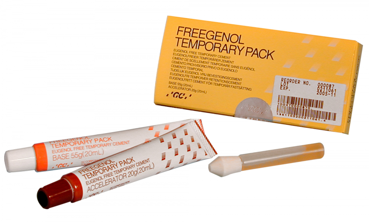 FREEGENOL TEMPORARY PACK Cemento provvisorio a base di ossido di zinco, senza eugenolo. Confezione: base da 55 gr + catalizzatore da 20 gr