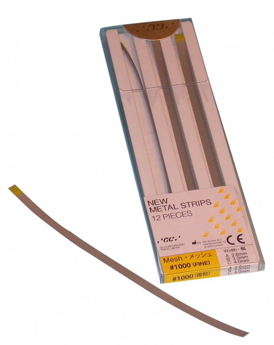 METAL STRIPS Strisce in metallo con un solo lato abrasivo, in 4 grane con codifica colore, con particelle di ossido di alluminio ad elevata flessibilità e resistenza, riutilizzabili e autoclavabili ripetutamente. Confezione da 12 strisce assortite in 3 altezze (2,6/3,3/4 mm) - lunghezza 13,3 cm