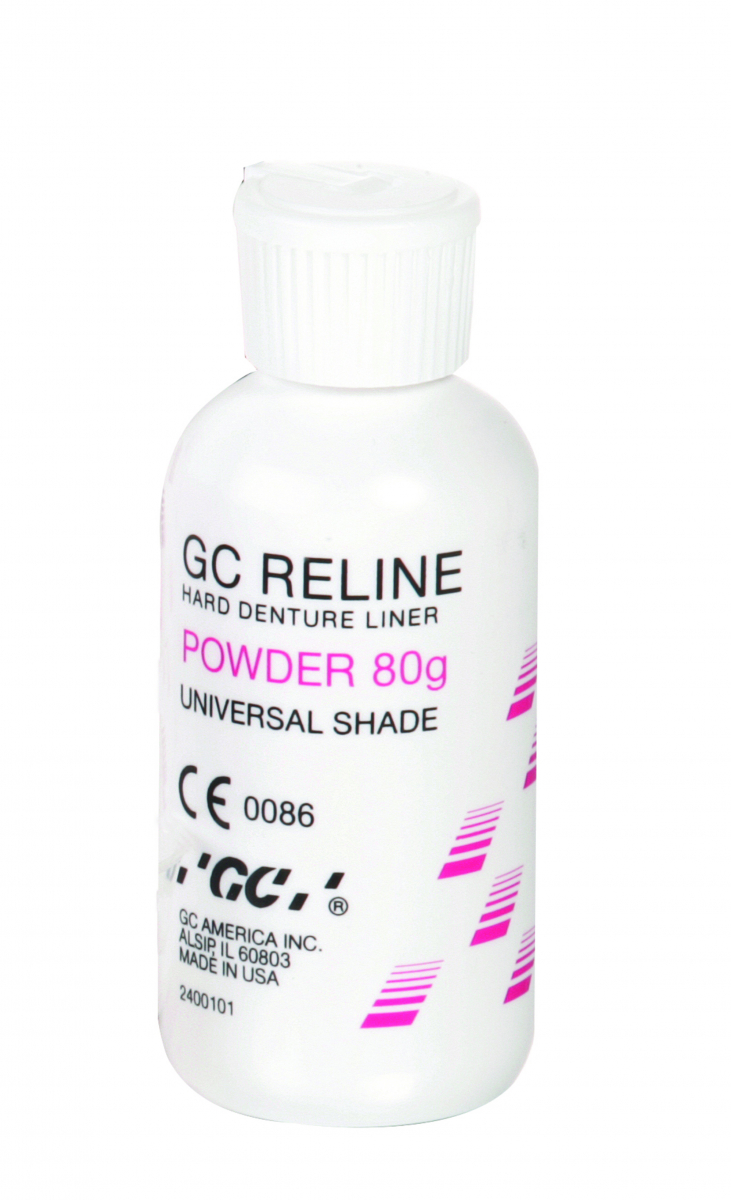 RELINE Resina per ribasature dirette, rigide, di protesi mobili. Non contiene metilmetacrilato e non provoca irritazioni chimiche del tessuto orale. Confezione di polvere da 80 gr