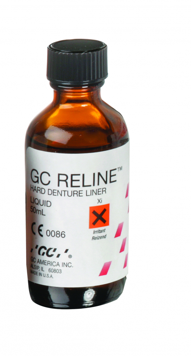 RELINE Resina per ribasature dirette, rigide, di protesi mobili. Non contiene metilmetacrilato e non provoca irritazioni chimiche del tessuto orale. Confezione di liquido da 50 ml