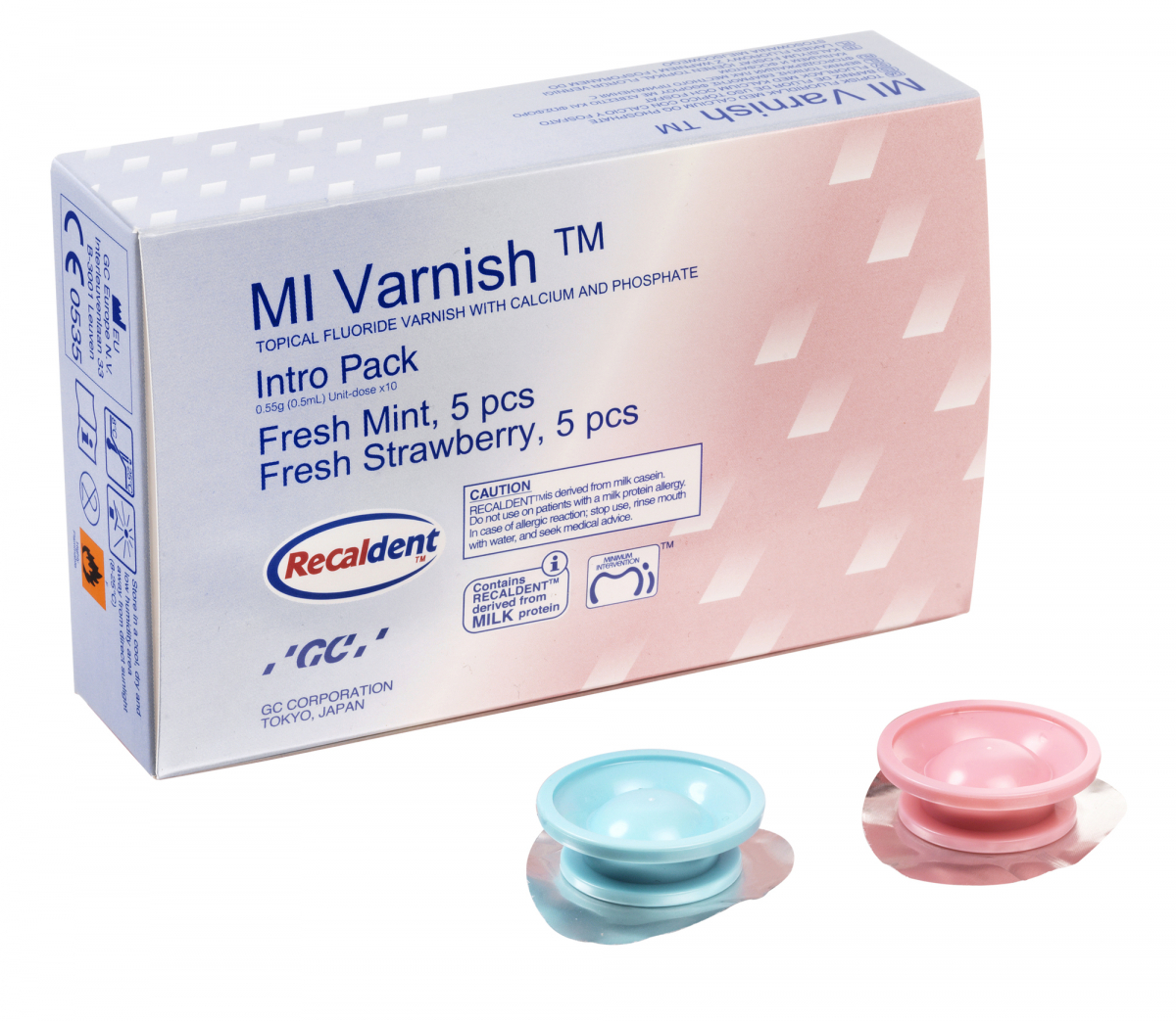MI VARNISH Vernice protettiva e desensibilizzante contenente calcio, fosfato e fluoro biodisponibili per la protezione dello smalto; oltre al fluoro (22600 ppm) contiene il 2% di Recaldent CPP-ACP (caseina fosfopeptide - fosfato di calcio amorfo). Semplice da applicare, indurisce a contatto della saliva. Colore bianco avorio che non altera l'estetica del dente. Ogni confezione monodose da 0,5 ml è sufficiente per trattare l'intera dentatura di un adulto. Disponibile in due gradevoli aromi: menta e fragola. Intro Kit: 10 monodosi da 0,5 ml cad. (5 gusto fragola, 5 gusto menta)