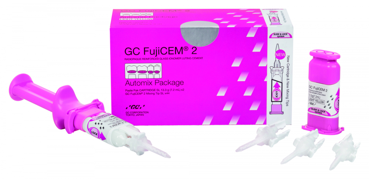 FUJICEM 2 SL Cemento a base vetroionomero resinosa, autopolimerizzante, per il fissaggio di ponti, corone, inlays ed onlays in composito, metallo e ceramica silanizzata. Una nuova tecnologia dei vetroionomeri ibridi ha permesso di aumentare la resistenza al carico flettente e alla compressione, garantendo un'assoluta sicurezza della cementazione anche in condizioni particolarmente critiche di stress occlusale. Massima protezione dovuta al rilascio di fluoro. Innovativo sistema Slide & Lock che consente l'inserimento e l'estrazione dei puntali miscelatori in maniera più rapida e semplice. Confezione: 2 cartucce Automix da 13,3 gr cad.