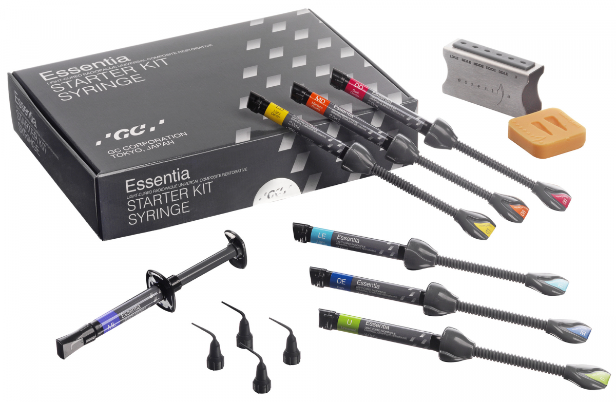 ESSENTIA Composito universale radiopaco fotopolimerizzabile per restauri, che introduce un nuovo paradigma nella tecnica di stratificazione. Essentia si basa sui concetti più avanzati di stratificazione estetica, si stacca dalle convenzioni offrendo un sistema di colori unico nel suo genere audace e diretto: sette colori per risolvere tutti i casi clinici. Essentia semplifica la scelta dei colori con sei principali opzioni di restauro: per anteriori, quattro opzioni in base all'età del paziente (denti sbiancati o di bambini, giovani, adulti e anziani); per posteriori, semplice tecnica a due incrementi o metodica facile con un solo colore usando Universal. Essentia offre ottima maneggevolezza ed eccellenti proprietà ottiche in tutte le situazioni: le dentine sono morbide per poterle modellare facilmente e garantiscono una corrispondenza cromatica eccellente, gli smalti sono leggermente più compatti e garantiscono un'ottima lucentezza, il colore Universal è compattabile per poterlo applicare facilmente nelle ar