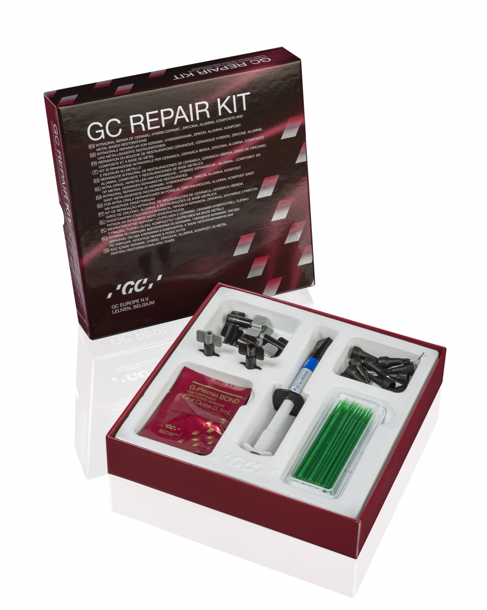 Un set completo di prodotti per riparare qualsiasi protesi direttamente in bocca. Kit composto da: 5 monodosi Ceramic Primer II + 5 monodosi G-Premio Bond + 1 siringa di Gradia Plus (OA1) da 2 ml + accessori