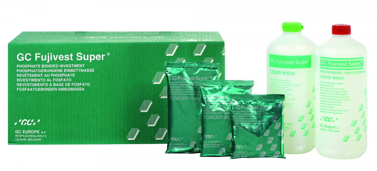 FUJIVEST SUPER Rivestimento fosfatico privo di grafite per fusioni di precisione con leghe preziose, semipreziose o palladiate. Particolarmente indicato per la fusione di protesi implantari complesse. Elevata precisione con leghe preziose anche per restauri estesi. Può essere usato con procedure di riscaldamento rapido o progressivo. Flacone di liquido da 900 ml