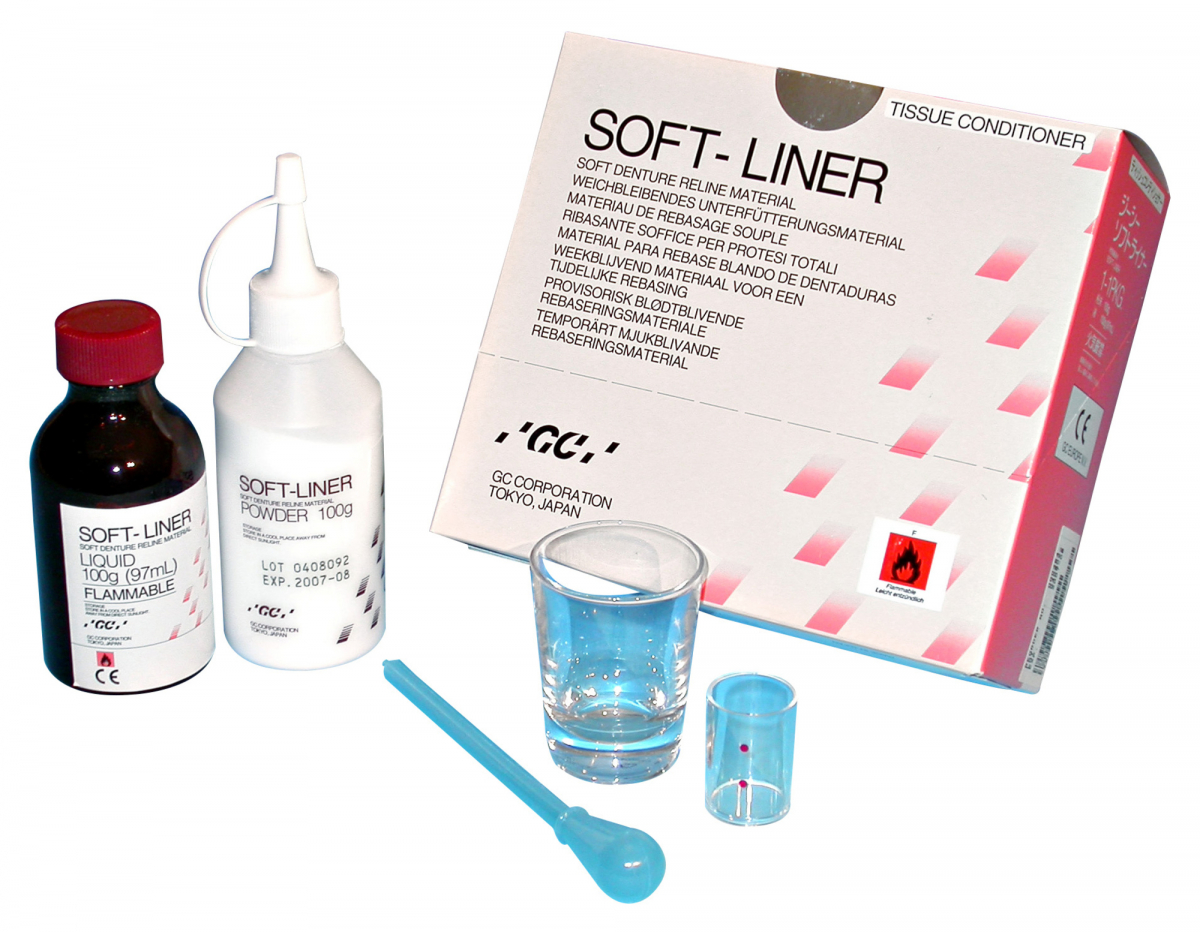 SOFT LINER Nuova resina acrilica per impronte funzionali e per ribasature provvisorie. Confezione: polvere da 100 gr + liquido da 100 ml + accessori
