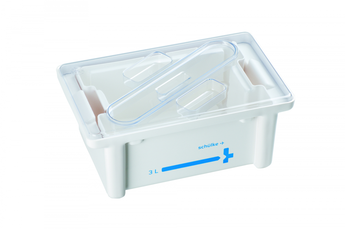 Vaschetta in PVC, con coperchio munito di feritoia per introdurre gli strumenti. Cestello interno forato ed estraibile. Termoresistente fino a 55ºC. Dimensioni: cm 25 x 15 x h 12. Capacità 3 litri. consente di immergere gli strumenti evitando possibili spruzzi e coperchio interno per la totale immersione dei componenti in plastica o gomma. Lo speciale PVC atossico con il quale è prodotta non altera i disinfettanti.