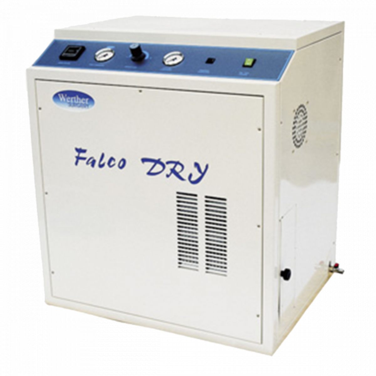 Il modello insonorizzato Falco Dry è indicato per due riuniti dentali: il suo motore monocilindrico offre 120 litri di aria al minuto, con serbatoio da 24 litri. Il sistema di essiccamento è composto da radiatore con ventola per la condensazione dell'umidità, filtro di scarico automatico per il drenaggio della condensa e tanica per la raccolta della stessa.