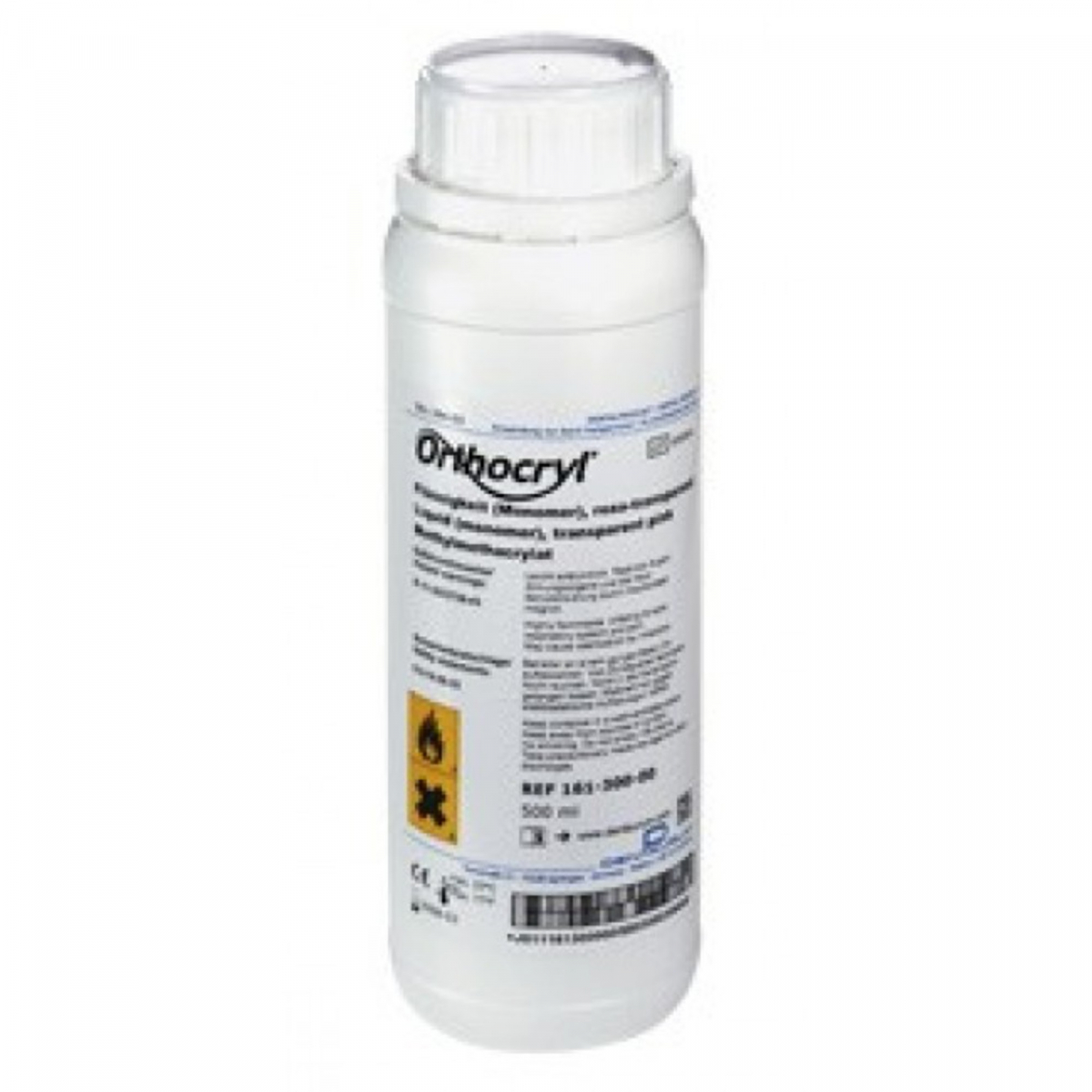 ORTHOCRYL - Dentaurum Resina autopolimerizzante per la realizz azione di apparecchi rimovibili; può ess ere impiegata sia con tecnica a spruzzo, sia ad impasto nel mortaio. Liquido da 500 ml Colore Rosa Trasparente