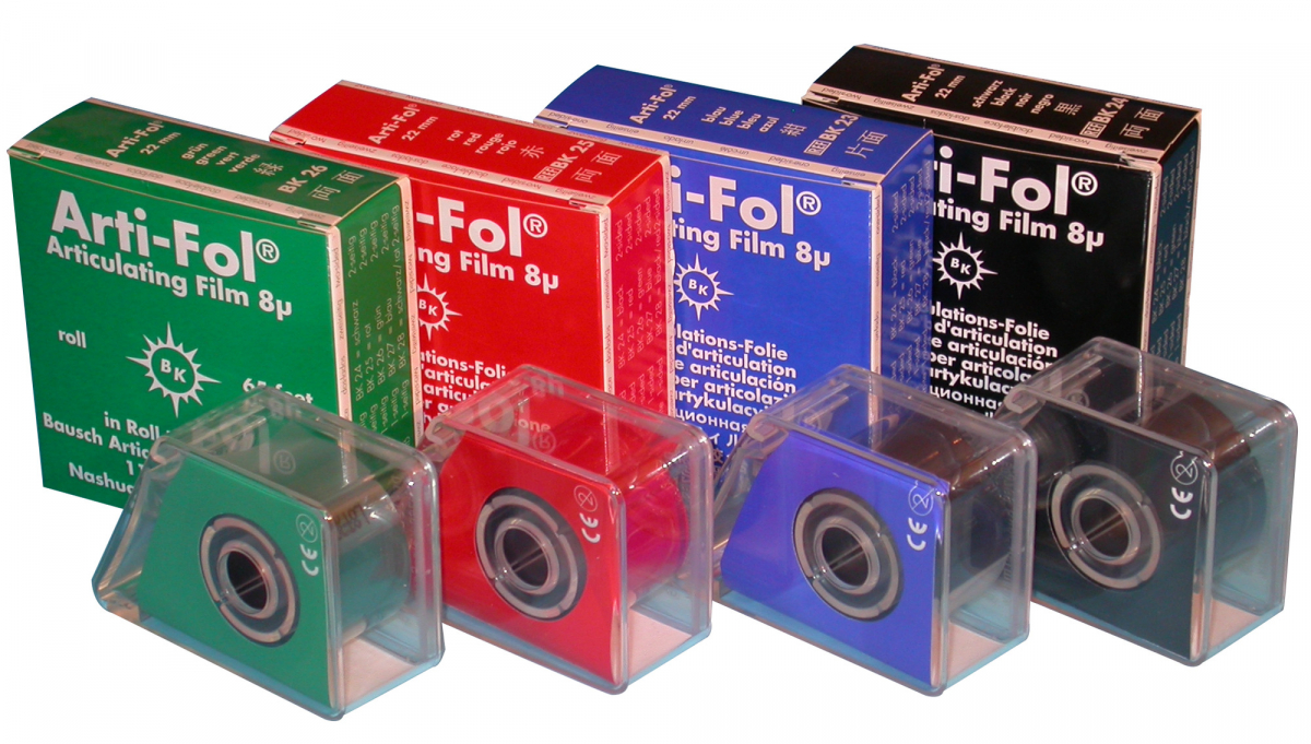 ARTI-FOL BK Film plastico ultra-sottile (8 micron), per il rilevamento finale di precontatti anche minimi; ricoperto di cere idrofile morbide che aderiscono anche su superfici umide. Rotolo da mm 22x20 m, con distributore in plastica - BK22 - Colore Verde 1 lato