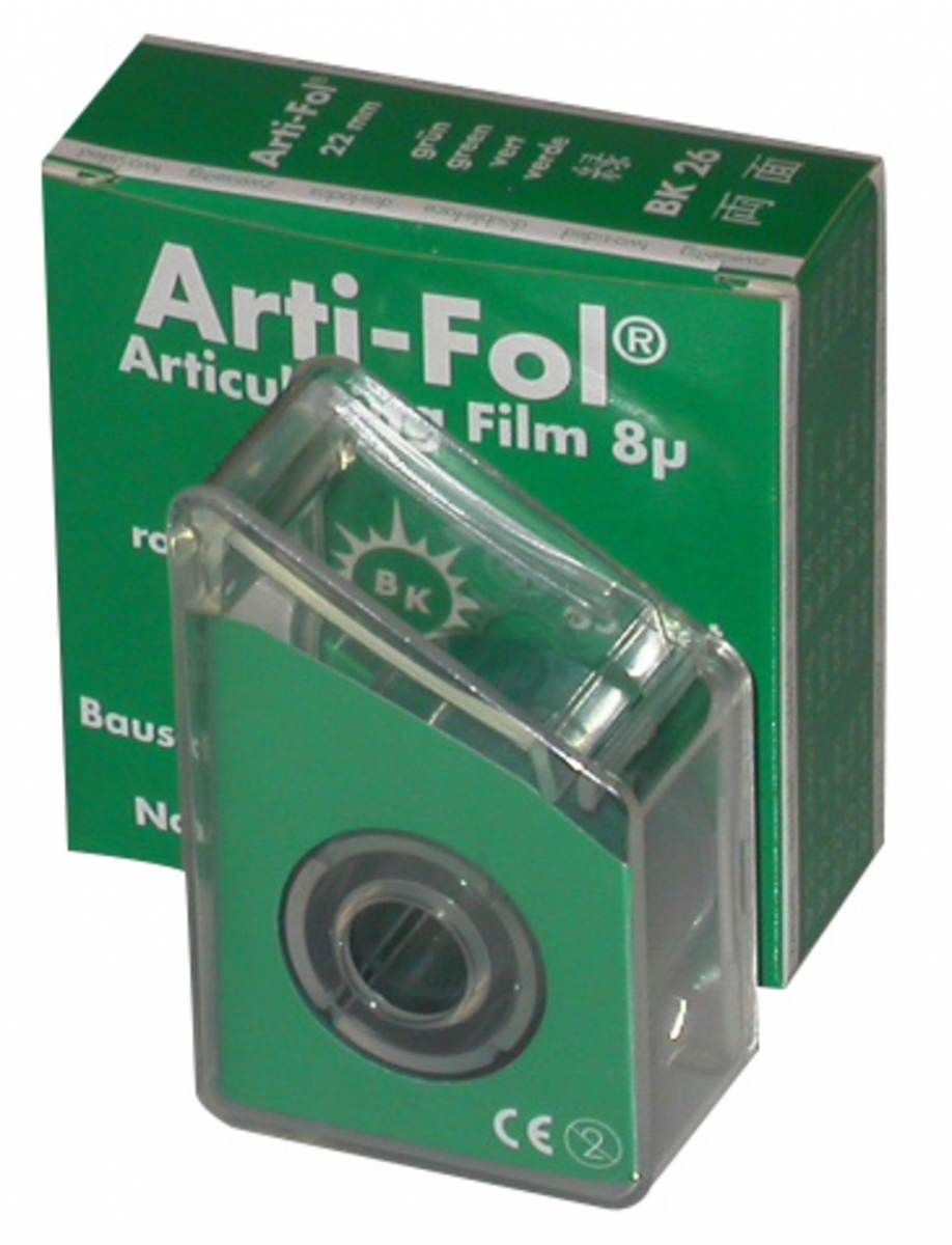 ARTI-FOL BK Film plastico ultra-sottile (8 micron), per il rilevamento finale di precontatti anche minimi; ricoperto di cere idrofile morbide che aderiscono anche su superfici umide. Rotolo da mm 22x20 m, con distributore in plastica BK26 - 2 lati Colore Verde/Verde