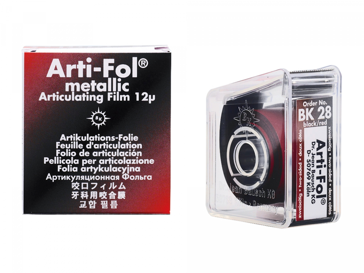 Film sottile 12 µ prodotto in poliestere metallizzato (Shimstock) unito ad da un rivestimento colorato su entrambi i lati, può essere utilizzata sia in campo asciutto che umido. BK 28 colore nero/rosso in rotolo, 22 mm x 20 metri, con distributore in plastica