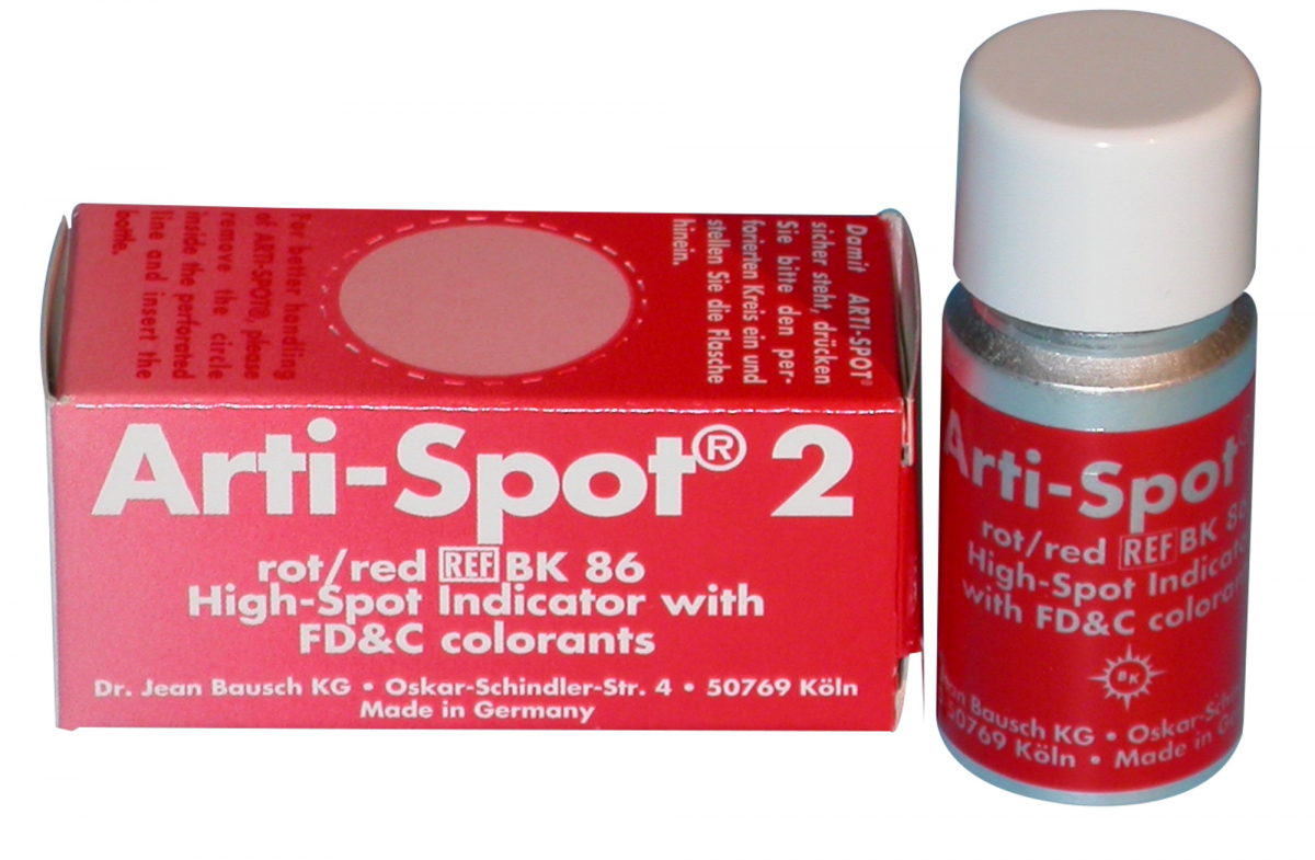 ARTI-SPOT BK Liquido colorato da applicare su protesi fisse prima della prova in bocca o su modello , indicato per corone , inlay , onlay per studio e laboratorio, il colorante alimentare e' assolutamente atossico .Flacone da 15 ml - BK86 - N. 2 Colore Rosso (ceramica)