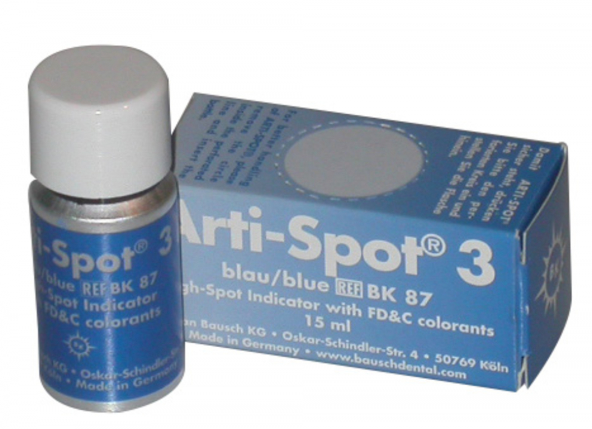 ARTI-SPOT BK Liquido colorato da applicare su protesi fisse prima della prova in bocca o su modello,indicato per corone,inlay,onlay per studio e laboratorio,il colorante alimentare e' assolutamente atossico . Flacone da 15 ml - BK87 - N.3 Colore Blu (per elementi di frizione )