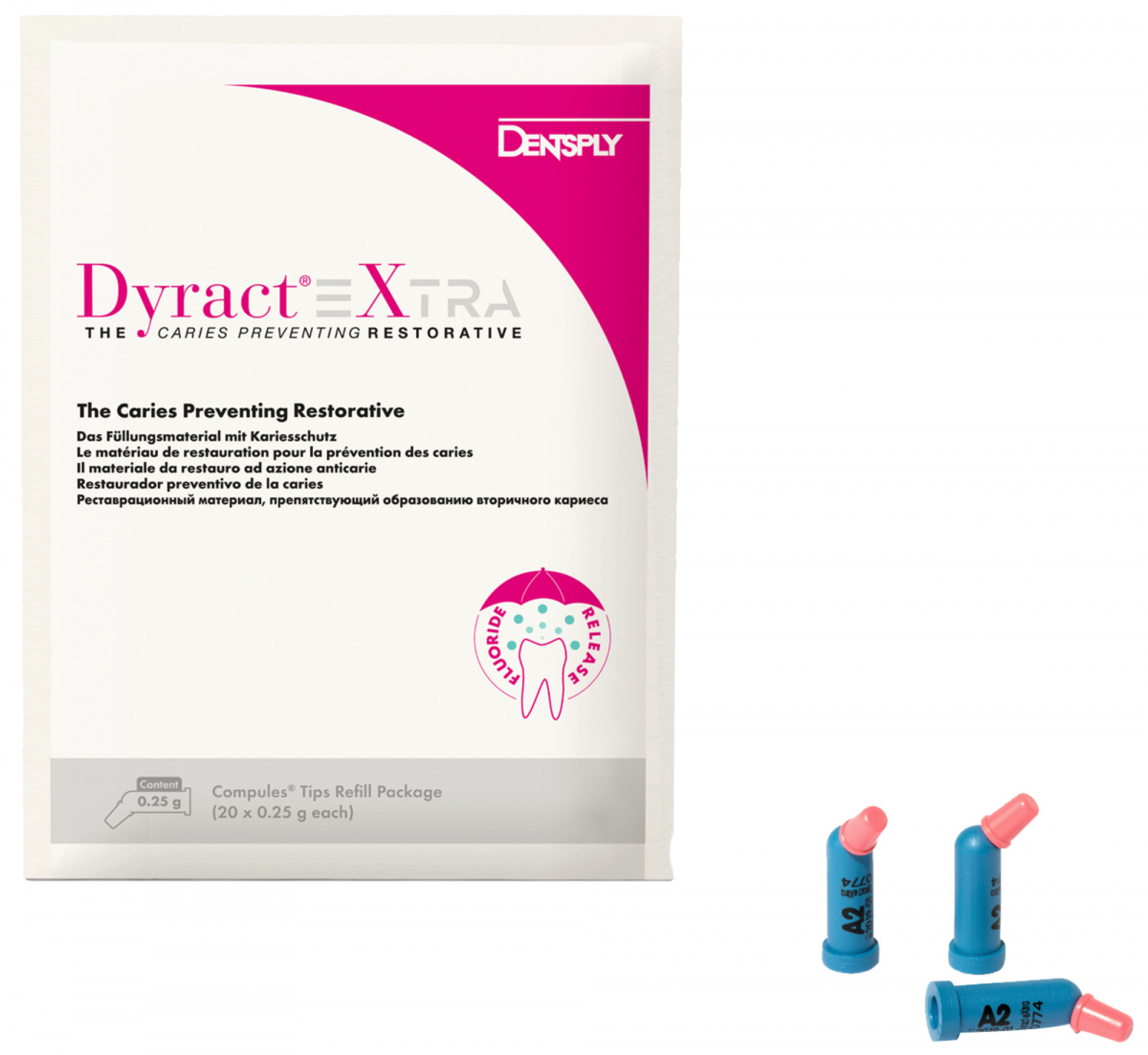 DYRACT EXTRA Compomero di nuova generazione, nato dall'evoluzione dei compomeri Dentsply. Resistente, a rilascio costante di fluoro, risulta particolarmente maneggevole: ha un tempo di polimerizzazione breve (solo 10") ma la lavorabilità è assicurata per 1'30". Confezione: 20 compules da 0,25 gr cad.