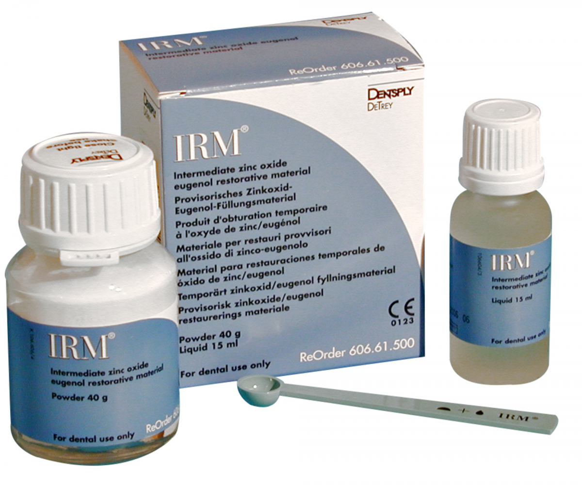 IRM Cemento per otturazione provvisoria, a base di ossido di zinco ed eugenolo, rinforzato con resina. A lunga durata, resistente, stabile nel tempo, è indicato sia in pedodonzia che in endodonzia. Kit base: flacone polvere avorio da 40 gr + flacone liquido da 15 ml