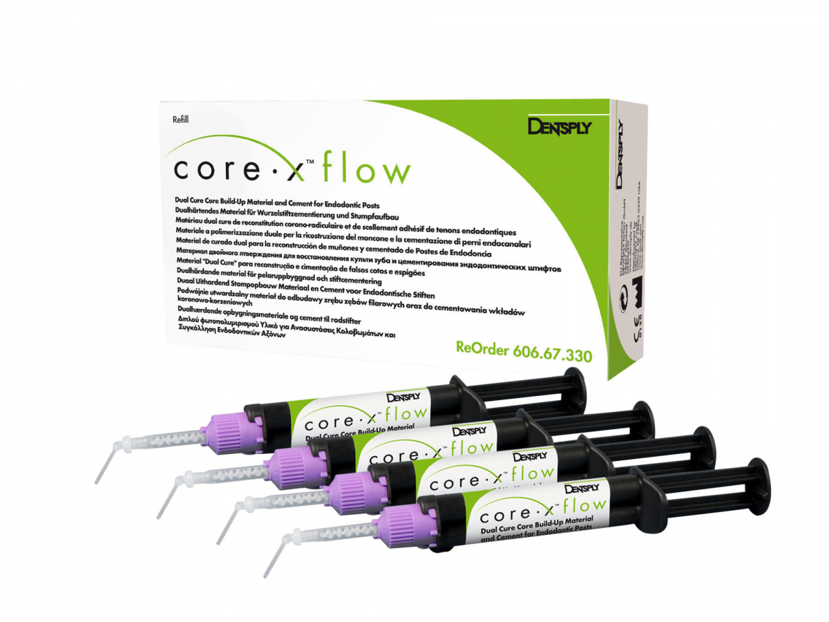 CORE-X FLOW Composito duale auto e fotopolimerizzabile, radiopaco, a rilascio di fluoro, per la cementazione di perni in fibra e la ricostruzione di monconi. Altamente riempito (69,1%) ha una consistenza simile alla dentina ed una fluidità ideale grazie alla quale si adatta perfettamente alle pareti canalari e al perno. Presenta un'alta resistenza alla flessione (120 Mpa) e alla compressione. In pratica siringa automiscelante che garantisce un corretto rapporto di miscelazione 1:1 dei componenti base e catalizzatore assicurando la migliore resa qualitativa del materiale e la predicibilità dei risultati. Confezione: 4 siringhe da 4,75 gr cad. + 20 puntali miscelatori + 20 terminali intraorali