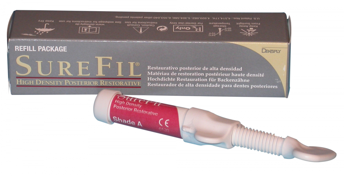 SUREFIL Composito fotopolimerizzabile, radiopaco, a cessione di fluoro, indicato per restauri diretti di classe I e II nei posteriori. Confezione Ricambio: 1 siringa da 3 gr Tinta A