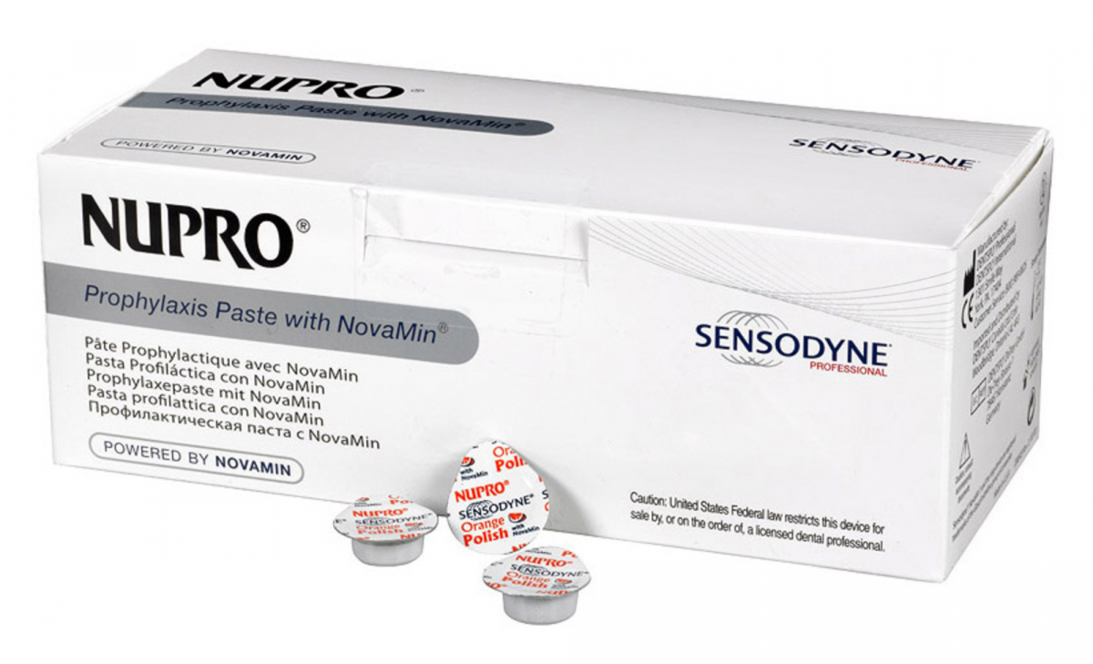 NUPRO SENSODYNE Pasta per profilassi che fornisce un immediato sollievo dalla sensibilità dentinale, mantenendo contemporaneamente le eccellenti proprietà di lucidatura e rimozione delle macchie. Nupro Sensodyne, supportato dall'esclusiva tecnologia NovaMin®, un ingrediente bioattivo che utilizza ioni di fosfato di calcio per occludere i tubuli dentinali e ridurre la sensibilità dentinale del paziente, offre il triplo beneficio della rimozione delle macchie, della lucidatura e della desensibilizzazione in un solo semplice passaggio. La pasta può essere applicata prima o dopo le procedure di ablazione per alleviare la sensibilità dentinale: è disponibile in due diverse grane (una da grossa a media per la rimozione delle macchie ed una da fine a media per la lucidatura). Non contiene coloranti ed è disponibile in gradevole sapore al gusto di arancia. VERSIONE SENZA FLUORO Confezione: 175 coppette + 1 appoggia coppette + 1 anello porta coppette