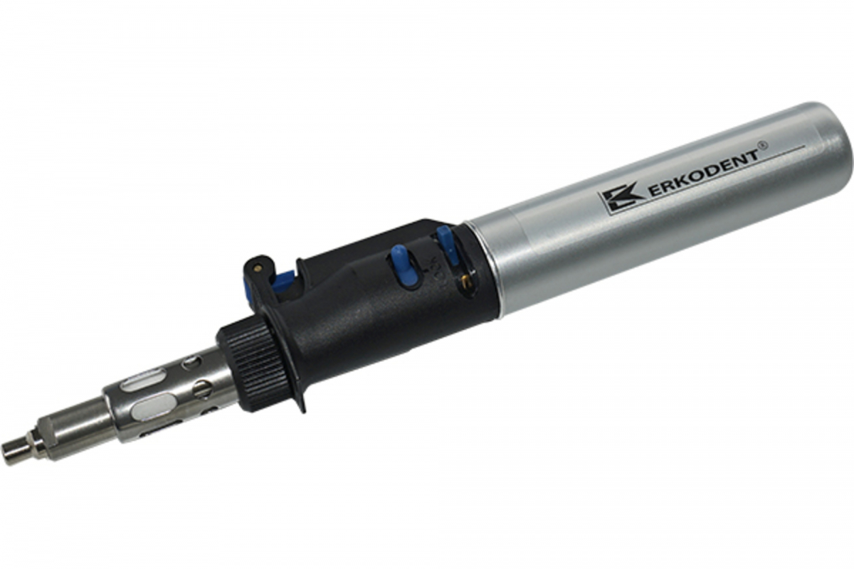 Bruciatore privo di fiamma, nessuna formazione di fuliggine o nerofumo. Ideale per rammollimento locale e brillantatura di Erkoflex e Erkoflex 95. Si usa con gas butano per accendini.