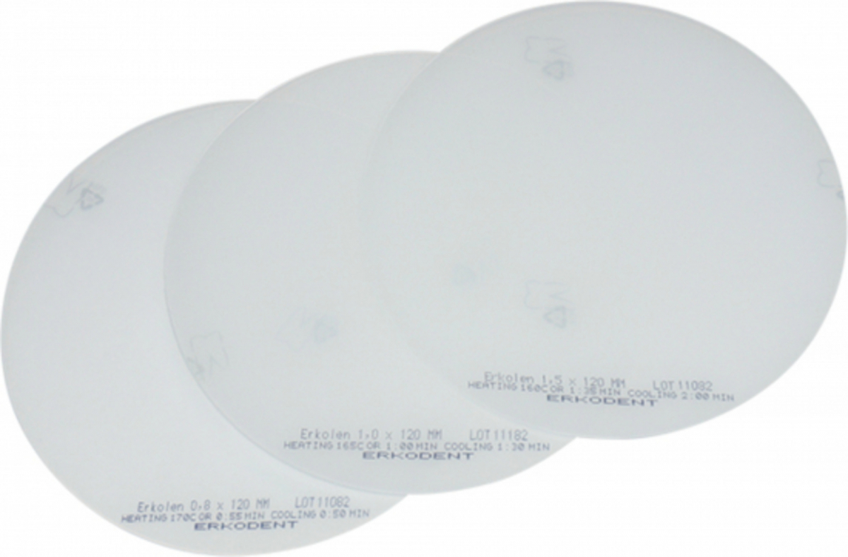 ERKOLEN Dischi per termoformatura in materiale morbido ed elastico, completamente calcinabile; non si lega con le resine acriliche. Prodotti in polietilene, innocui per la salute con biocompatibilità certificata. COLORE OPACO-NATURALE SPESSORE 1,5 mm - Ø 125x125 mm. CAPPETTE DI FUSIONE. Confezione: 20 pezzi