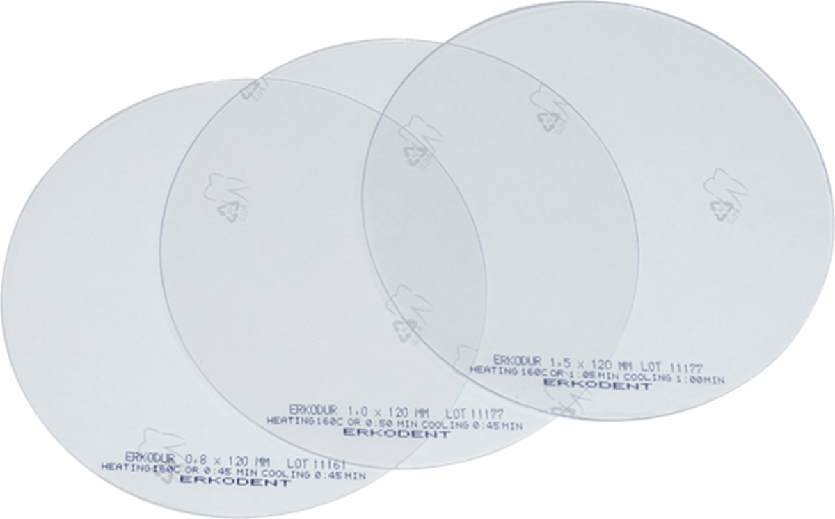 ERKODUR Dischi per termoformatura rigidi e duri, particolarmente resistenti agli urti. Deformabilità ottimale in fase di stampaggio; si unisce alle resine acriliche. Ipoallergenici, biocompatibilità certificata. COLORE TRASPARENTE. SPESSORE 2,0 mm - Ø 120 mm: impacchi parodontali, bite occlusali, adattamento occlusale con resina (resilit). Confezione: 10 pezzi