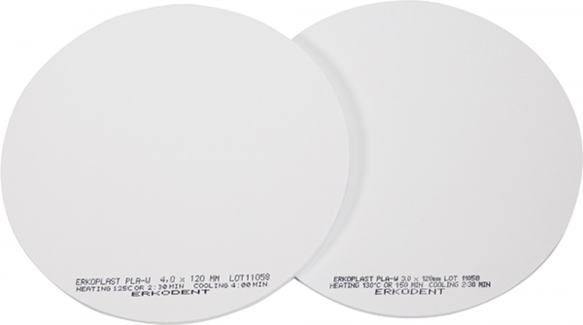 Dischi in acido polilattico (PLA). Materiale resistente agli urti, molto rigido. Si unisce con il calore e si lega alla resina autopolimerizzante.