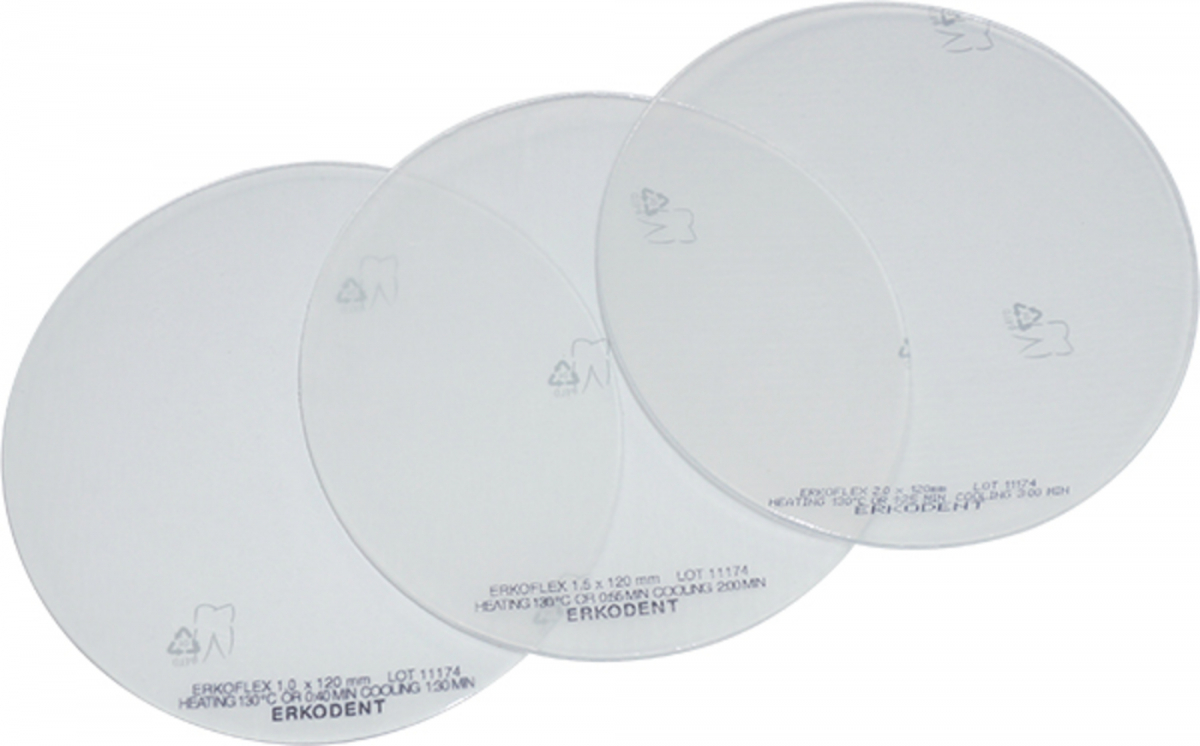 ERKOFLEX Dischi per termoformatura flessibili, ad elevata elasticità e stabilità di forma. Prodotti in resina termoplastica etilvinilacetato (EVA); innocui per la salute con biocompatibilità certificata. Non si legano con le resine acriliche. ERKOFLEX: durezza 82 Shore A. COLORE TRASPARENTE. SPESSORE 5,0 mm - Ø 120 mm: posizionatori - protezioni dentali - duplicazione. Confezione: 10 pezzi
