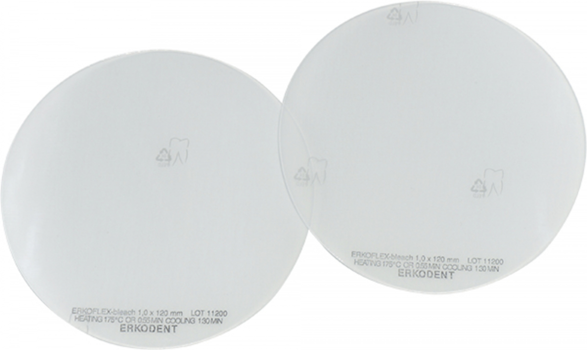 ERKOFLEX Dischi per termoformatura flessibili, ad elevata elasticità e stabilità di forma. Prodotti in resina termoplastica etilvinilacetato (EVA); innoCui per la saluteCcon biocompatibilità certificata. Non si legano con le resine acriliche. ERKOFLEX BLEACH: durezza 82 Shore A. COLORE TRASPARENTE SPESSORE 1,0 mm - Ø 120 mm: docce di fluorurazione e di sbiancamento morbide - protezione di modelli. Confezione: 100 pezzi