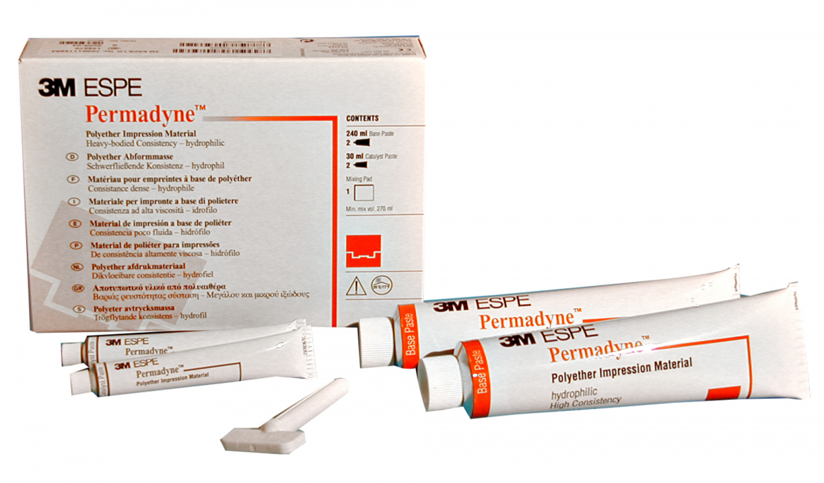 PERMADYNE Polietere per impronte di precisione in un'unica fase, a due viscosità. Versione a miscelazione manuale. Tipo HV (ad alta viscosità) - Colore Arancione Confezione Doppia: 2 tubi base da 120 ml cad. + 2 tubi catalizzatore da 15 ml cad.