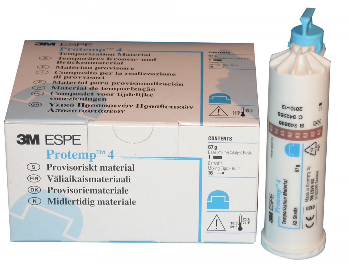 PROTEMP 4 GARANT Versione rinnovata della resina composita per provvisori, autopolimerizzante a freddo, ideale per tecnica diretta. Rispetto al Protemp 3 Garant presenta migliori caratteristiche estetiche ed una maggiore resistenza all'usura. Confezione Ricambio: 1 cartuccia da 67 gr + 16 puntali miscelatori blu Garant