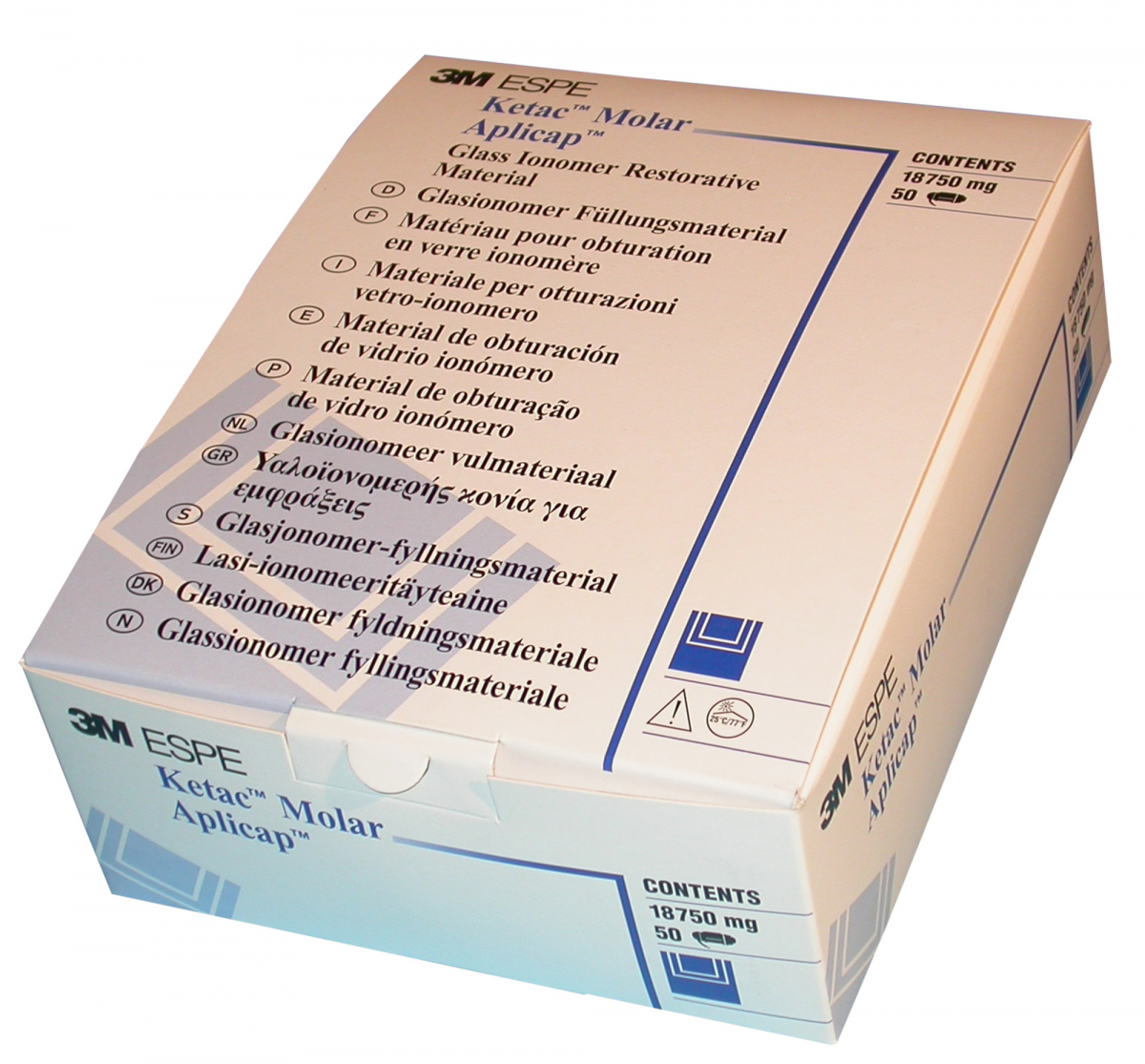 KETAC MOLAR APLICAP Cemento vetroionomero, radiopaco, ad elevato rilascio di fluoro, per restauri di V classe, denti decidui, monconi e sottofondi. In capsule predosate. Confezione Ricambio: 50 capsule (colore A3)