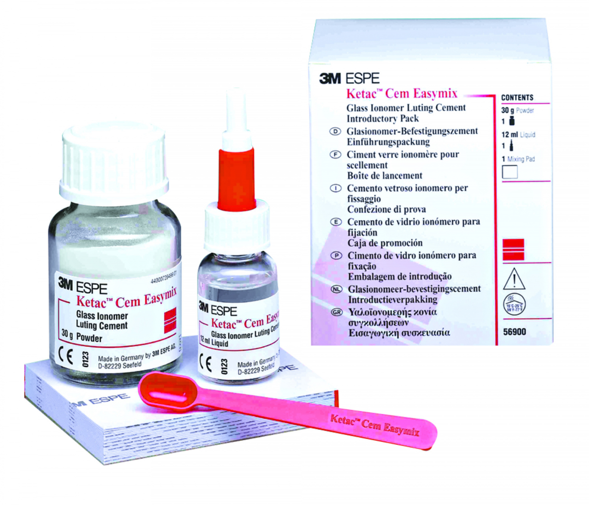 KETAC CEM EASYMIX Cemento radiopaco per il fissaggio definitivo (applicazioni ortodontiche incluse), a base vetroionomerica. Grazie all'estrema finezza della polvere (solo 17 micron) è facilmente miscelabile, ed è caratterizzato da un'eccellente adesione e da una minima solubilità. Starter Kit: polvere da 30 gr + liquido da 12 ml + accessori