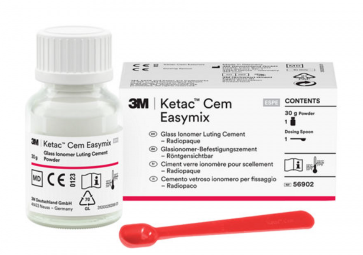 KETAC CEM EASYMIX - 3M Espe Cemento radiopaco per il fissaggio defin itivo, a base vetroionomerica. Grazie al l'estrema finezza della polvere (solo 17 micron) è facilmente miscelabile: carat terizzato da un'eccellente adesione e da una minima solubilità. Nuova formulazio ne per una miscelazione più semplice e r apida. Confezione ricambio di polvere da 30 GR + 1 cucchiaio dosatore